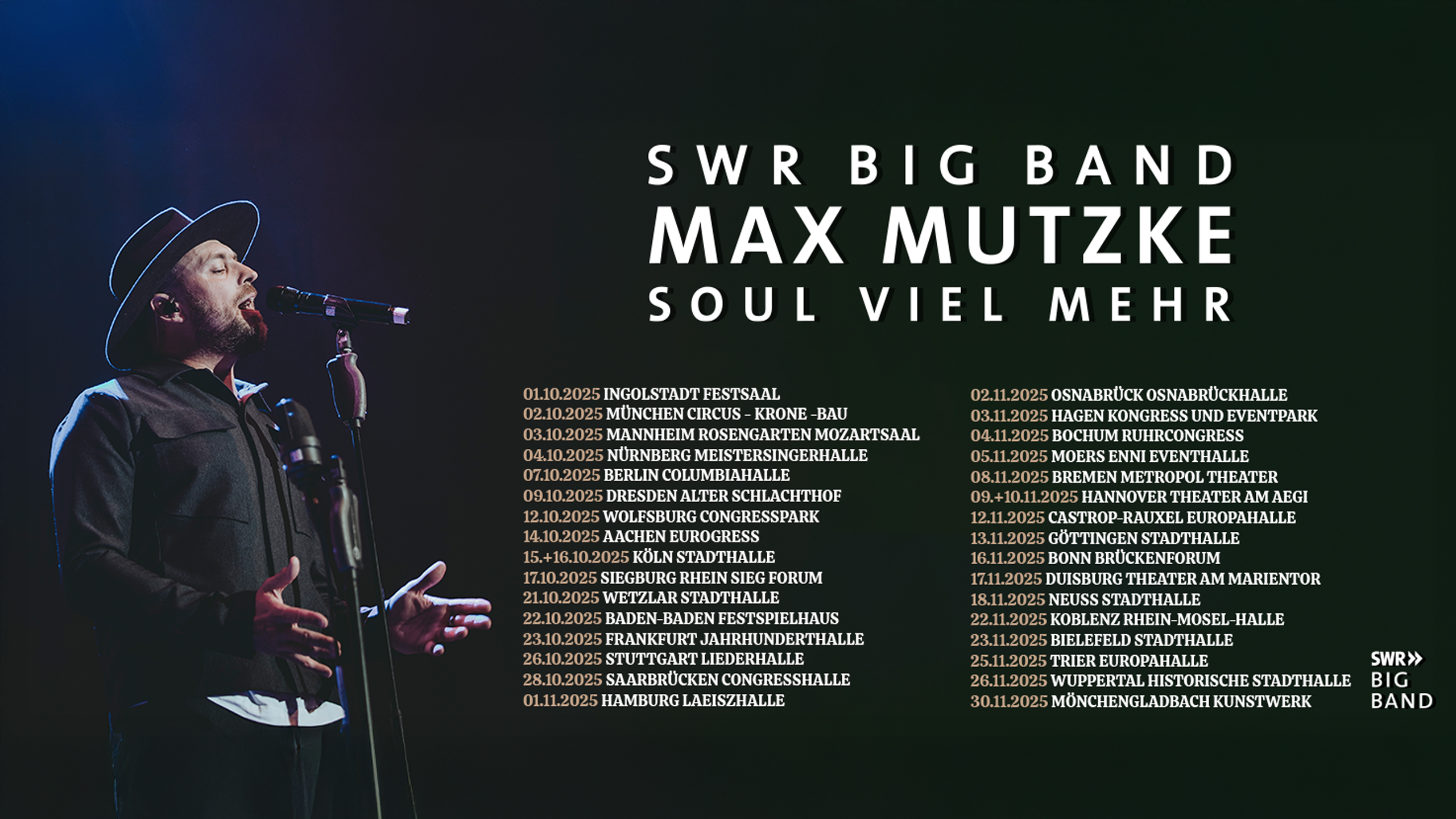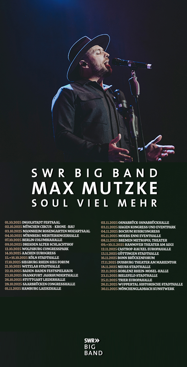- 30.11.2025DE: Mönchengladbach (Wichrath)Max Mutzke in Mönchengladbach (Wickrath) mit SWR Bigband